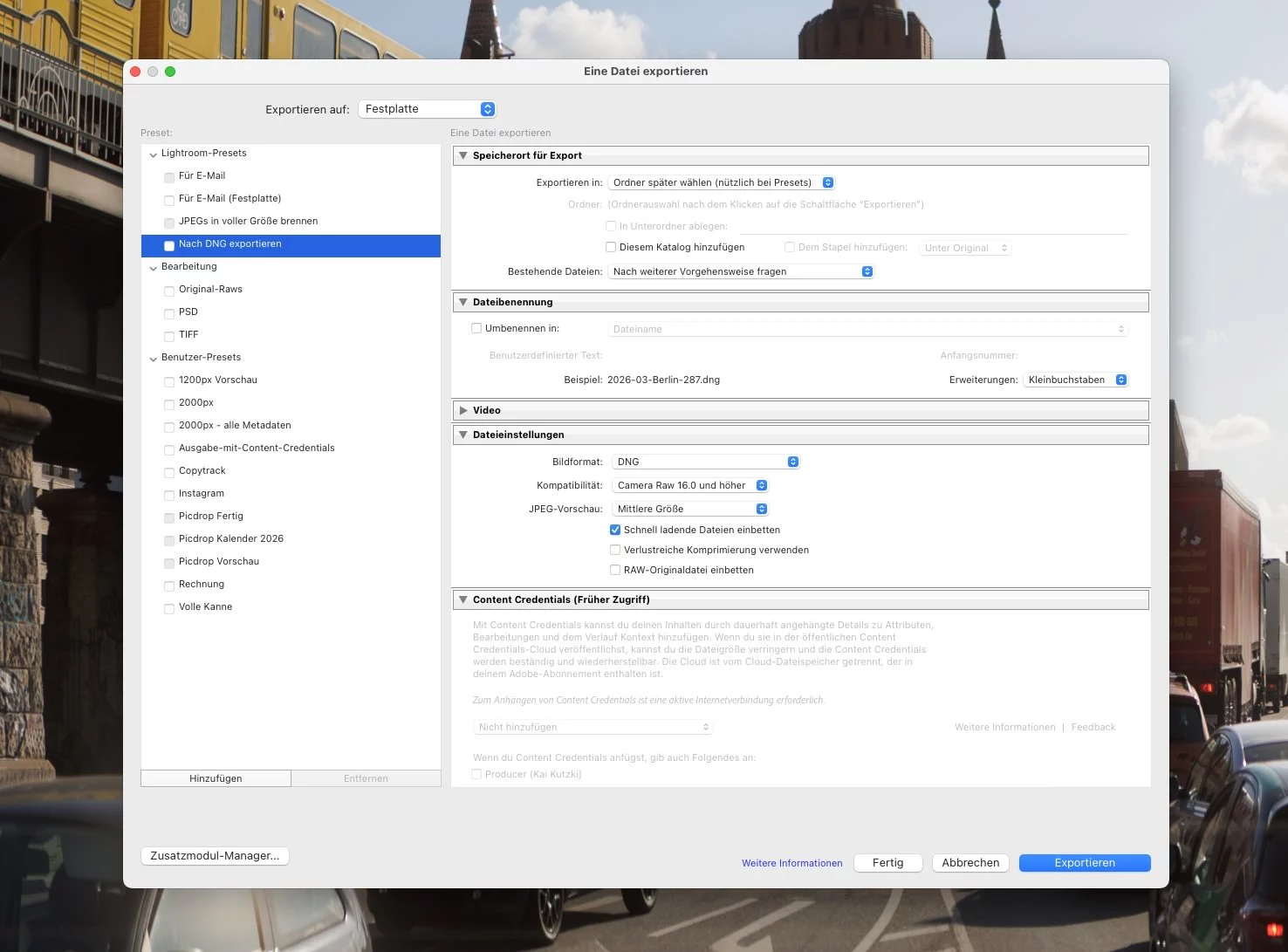 Zuerst konvertierst du deine RAW-Dateien ins DNG-Format. Das geht am einfachsten über Lightrooms Export-Menü. Dafür markierst du alle Bilder, die du umwandeln möchtest und drückst ⌘ + Shift + E. Dort gibt es dann im Ordner Lightroom-Presets schon eine Vorgabe dafür. Speichere die fertigen DNG-Dateien am besten in einen eigenen Unterordner.